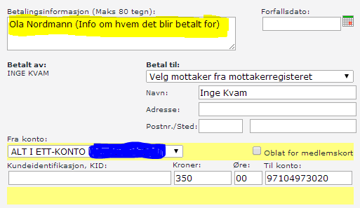 350 kr innbetales til kontonummer 97104973020